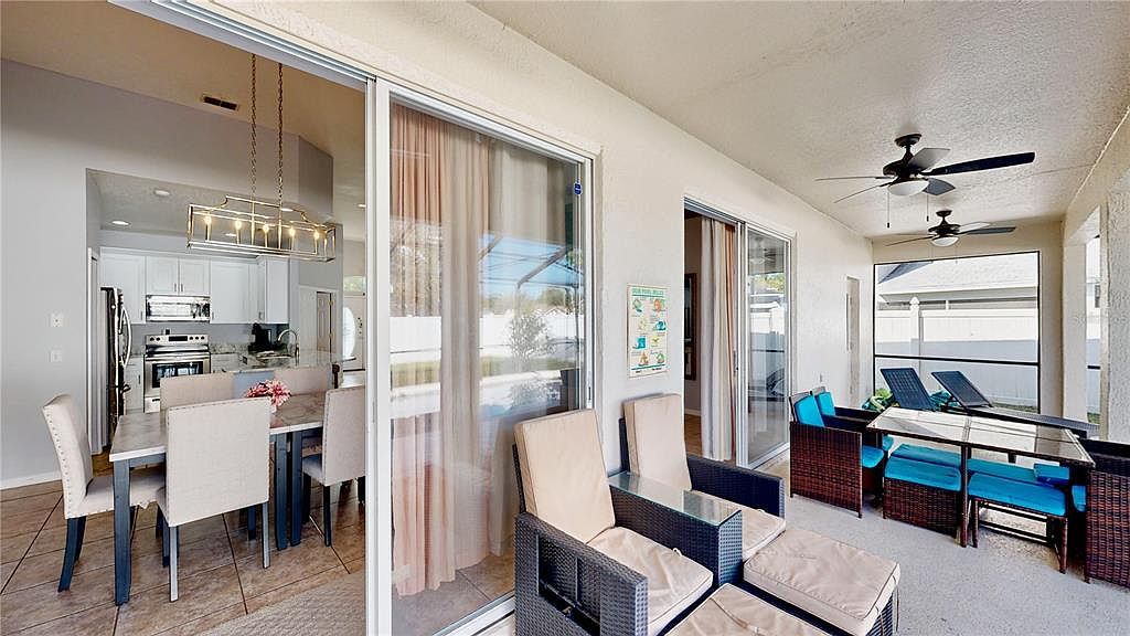 A quick glimpse is all it takes to imagine the hours of fun that await in this swimming pool with its patio, outdoor hangout zone, lanai and ceiling fans.